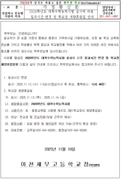 2026학년도 대학수학능력시험 실시에 따른 일과시간 변경 및 학교장 재량휴업일 안내